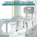 Banco de casa de banho fabricado com uma estrutura em alumínio, um material resistente e leve, com um encosto removível e assento em forma de U, que facilita a higiene pessoal, possuindo orifícios de drenagem para evitar a estagnação da água durante o duche. Apresenta uma altura regulável de acordo com a estatura do utilizador e pontas de borracha antiderrapante nas quatro pernas, para uma maior estabilidade, conforto e segurança na posição de sentado. Adequado para idosos, pessoas com mobilidade reduzida ou que, por razões de saúde, não podem estar de pé durante longos períodos de tempo. Inclui um conjunto de ferragens para a montagem.